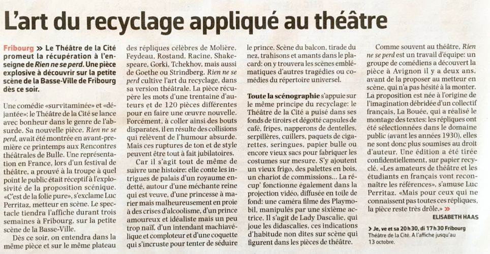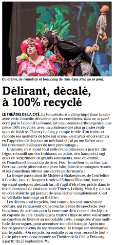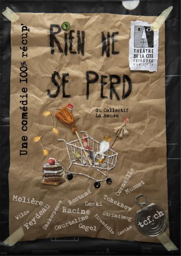 Résultat : un texte hilarant et absurde où pour la première fois Courteline répond à Shakespeare, Tchekhov à Musset, Molière à Goethe… Des costumes haute couture faits en emballages alimentaires, panosses, fripes et produits d’entretien… Des décors en playmobils, frigo, palettes CFF et autres encombrants détournés… Le tout sur un fond de musiques de films qui soulignent l’anachronisme.